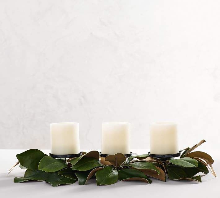 Create a beautiful tablescape with this magnolia candle holder as a centerpiece for your Thanksgiving meal. Add pumpkins and pinecones along the sides.