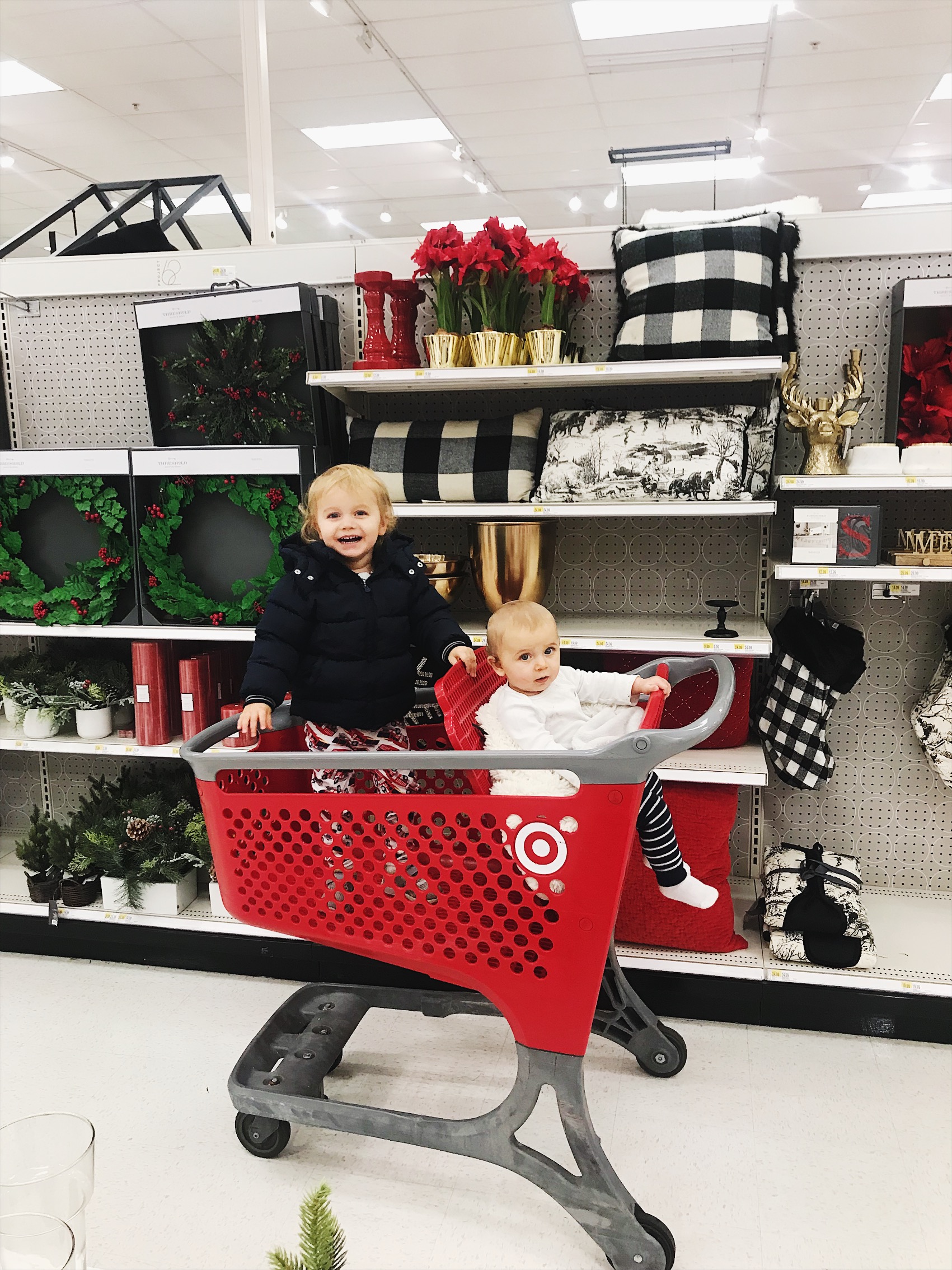 TIP 2 : SHOPPING CARTS NOT PROVIDED. Our UppaBaby stroller is always in our trunk and comes in handy during these times. Henry’s car seat will fit right in the stroller and James will walk right along side me. In the early days when James was still wobbly on his feet, I would put the boys in the double stroller. Sometimes I would even hold James as we walked through the store because the shop was too small for a double wide. Another option is to put Henry in the baby carrier and James in the stroller if you are going on longer walks.