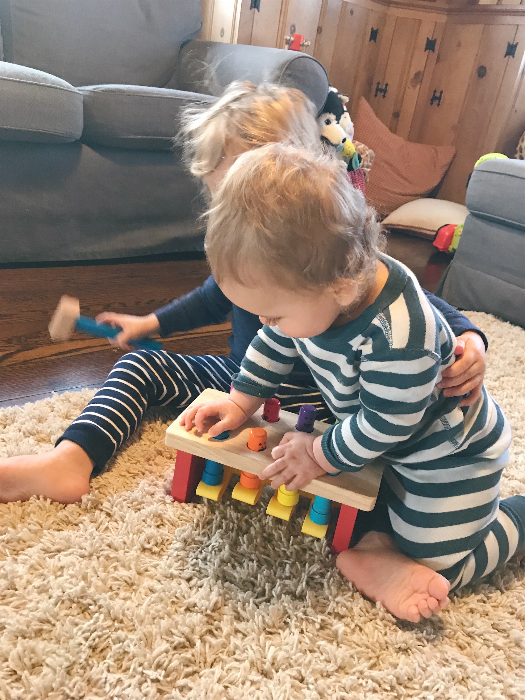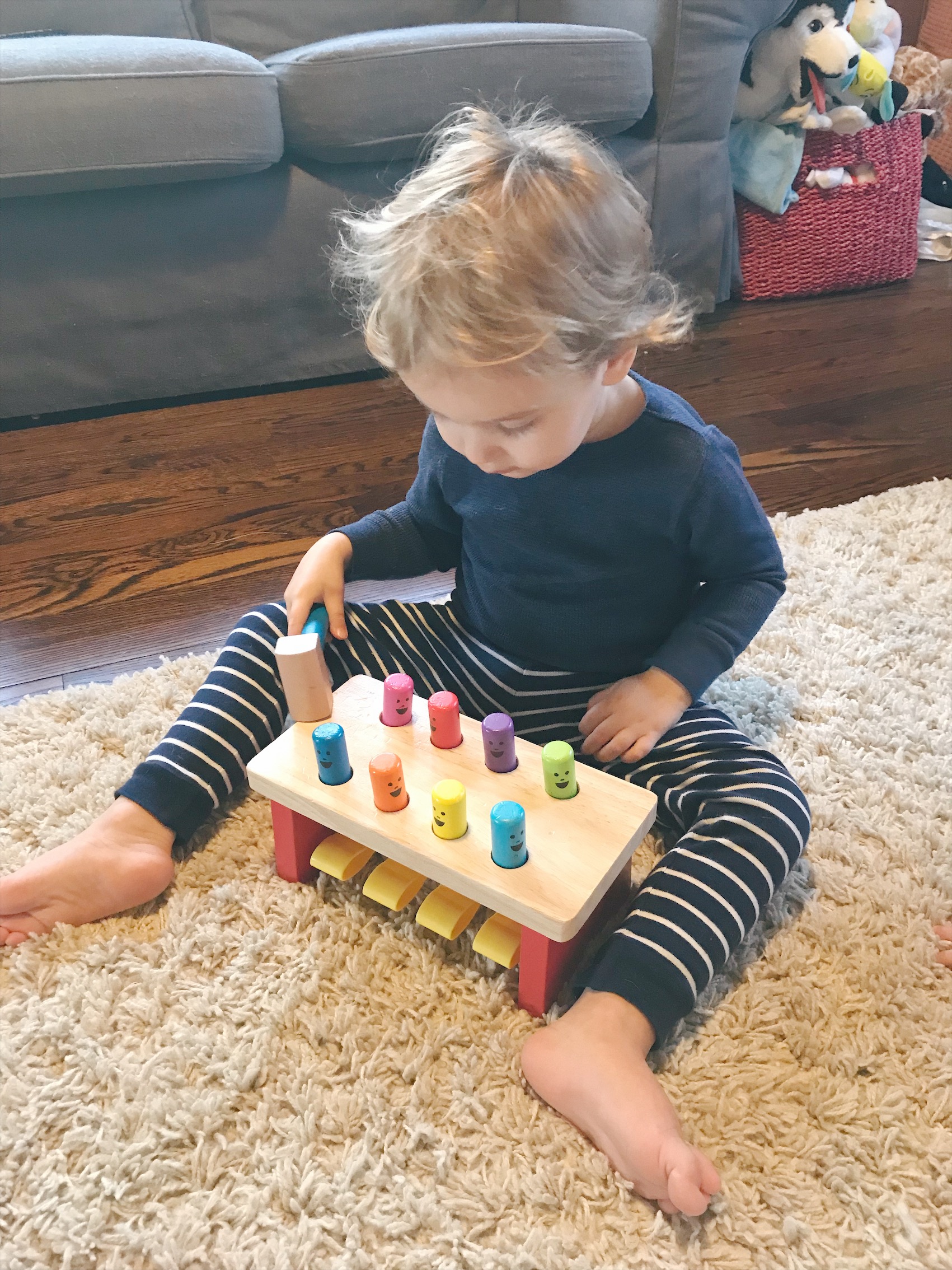 Pounding Bench with Mallet – Using eye-hand coordination is key for using this toy! If you see the above picture, it did not end well for Henry’s hand 😦
