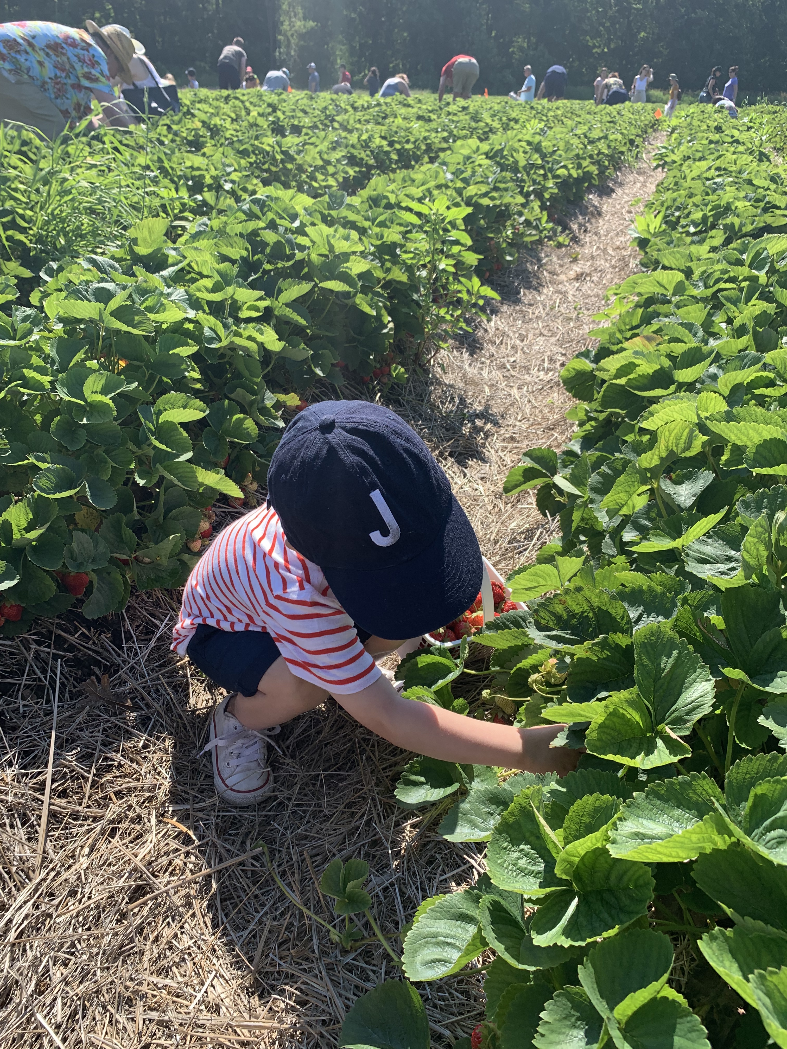 After grabbing our baskets (there are several different sizes to choose from), we boarded a tractor, known as the berry ferry, to take us to the strawberry rows which was about a 2 minute ride. Henry was grinning ear to ear the entire time and James kept saying the tractor was so beautiful! After departing the tractor, you are escorted to your own row to pick from and you can see the vast farmland ready to be harvested all around. We got to our spot and began picking right away. The best crops to pick are bright red and ripe as the strawberries will not continue to ripen once picked. Another helpful hint is to keep the stem in tact because it keeps the strawberries fresher longer!