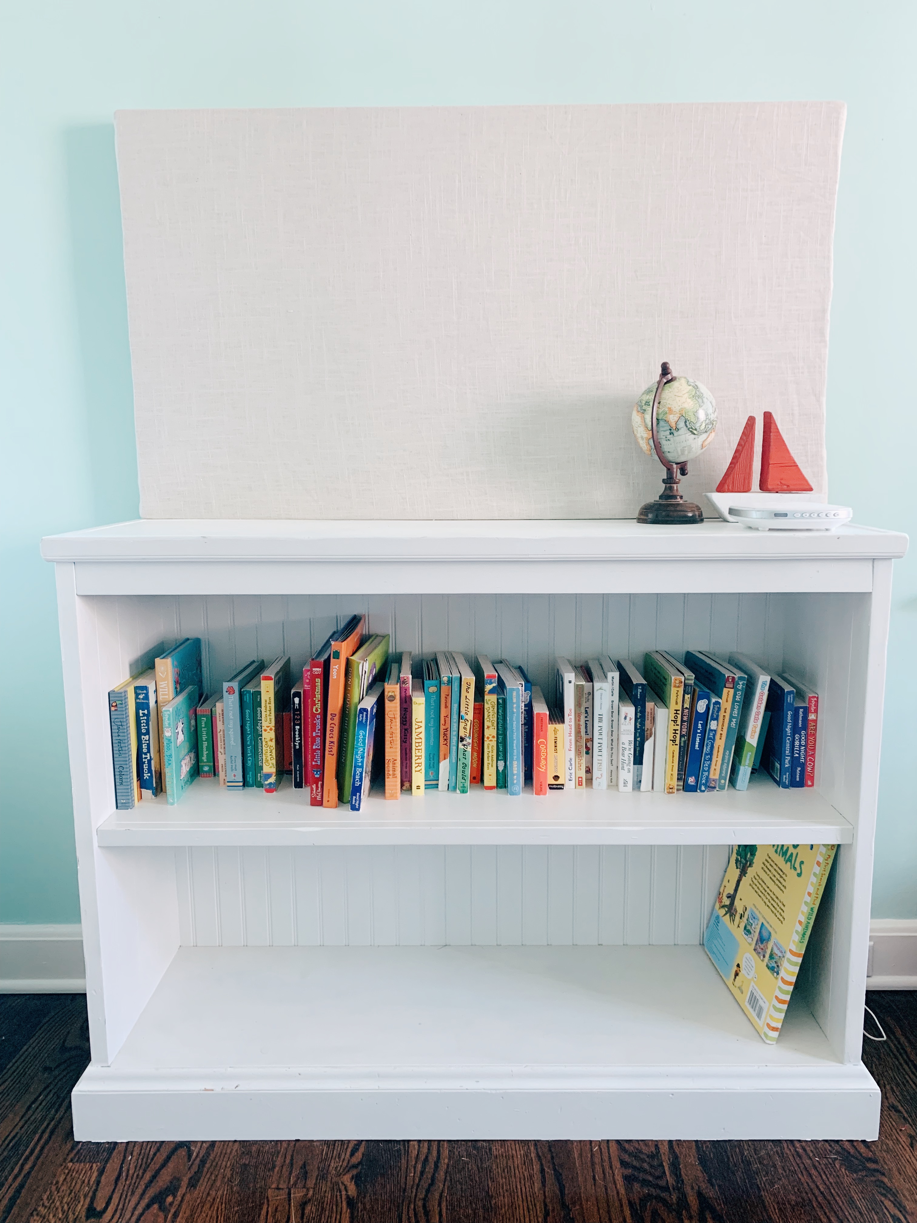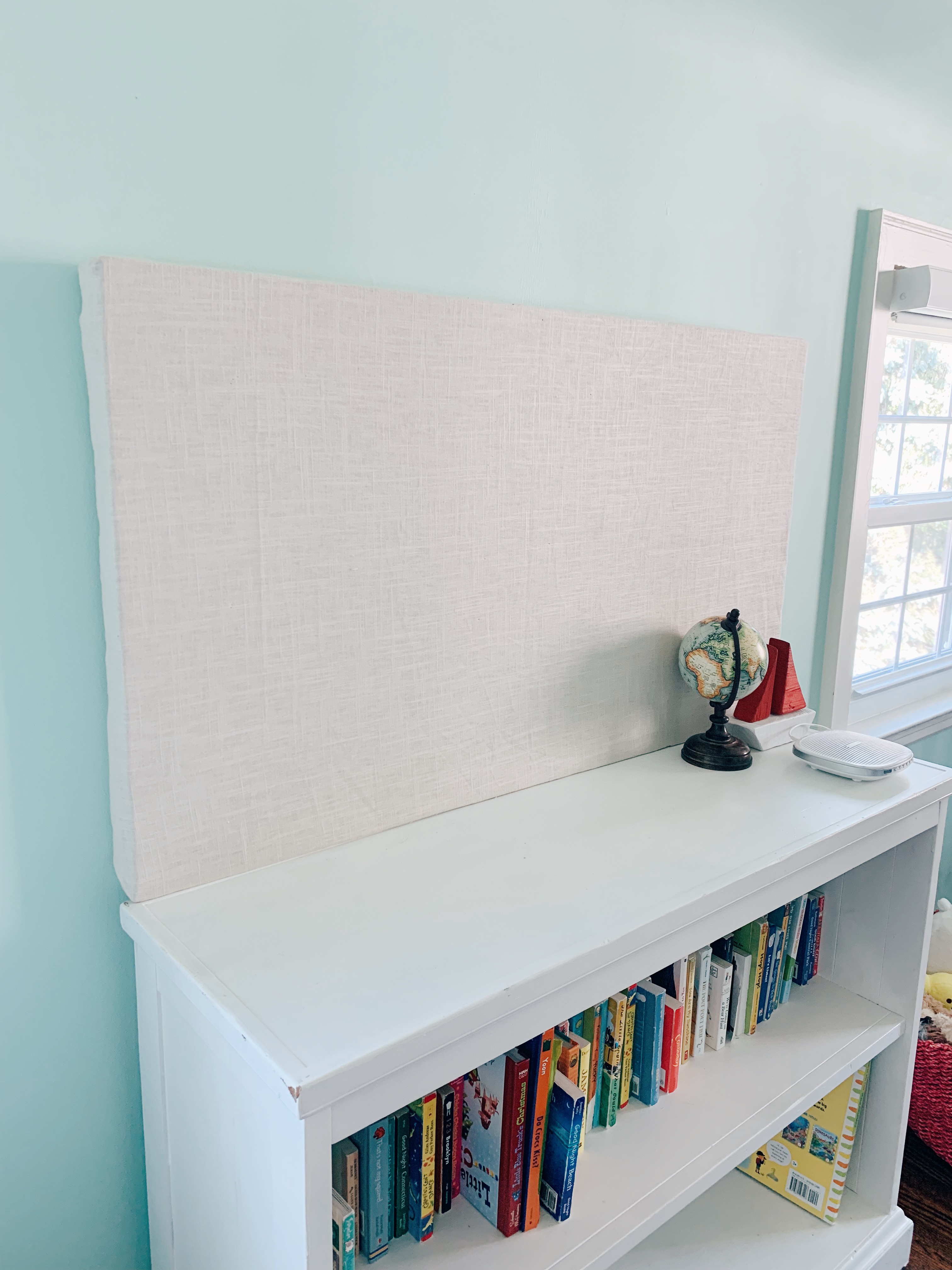 As I was searching for a piece to place behind the boys’ bookcase, I was stuck between artwork and a bulletin board. When I weighed the pros and cons of both I ultimately chose the board route because I love the idea of pinning photos, art the boys make and keepsakes all at once! However, during the search, I fell short of affordable, cute options. That’s when my DIY light bulb popped up! I first saw Jennifer Hughes’ DIY linen pinboard here and knew I had to replicate. She always has great ideas and her taste and style are impeccable!