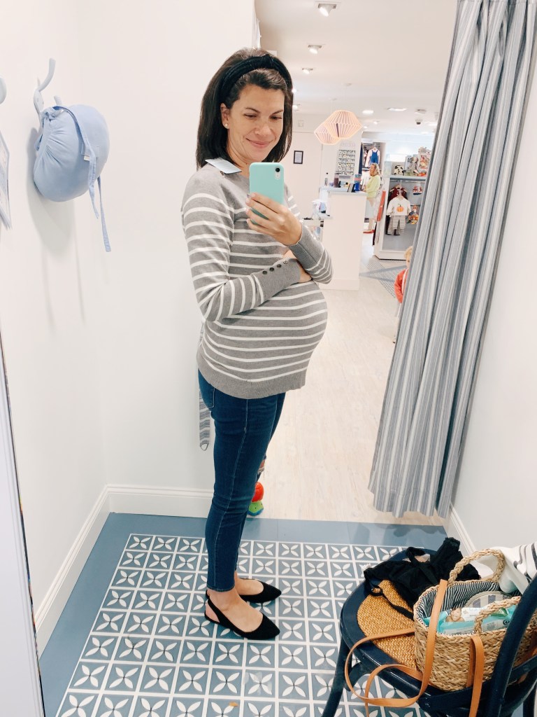 My adviser was amazing and pulled a bunch of pieces she thought I would be interested in. She was spot on! Anything involving stripes is right up my alley. Right before I tried on the clothing, I was professionally fitted for a bra, which I’ve honestly never done! Henry even got to help out 😉 It was super helpful and I was able to wear a nursing friendly bra to try on all the clothes. I loved it so much I brought it home with me (along with a pair of leggings and overalls)!