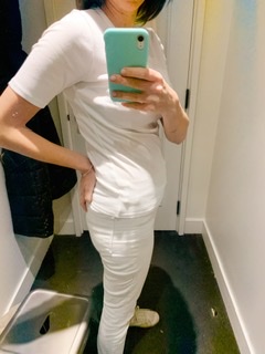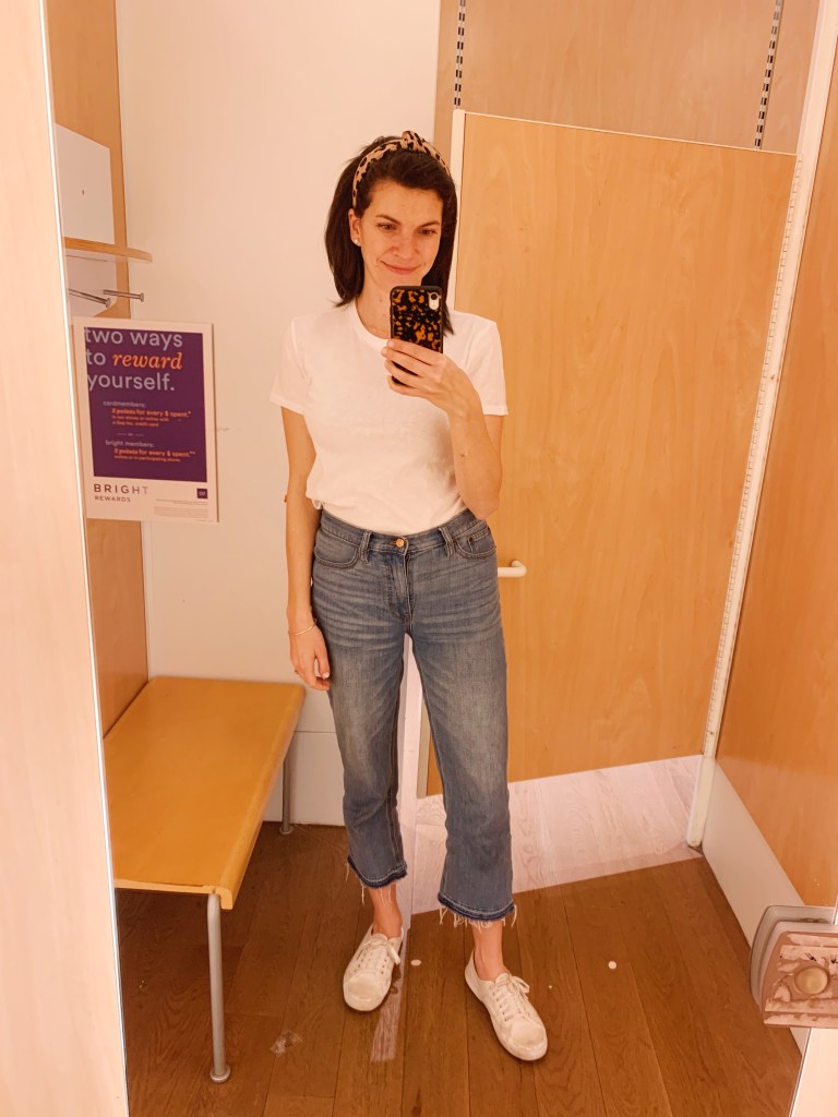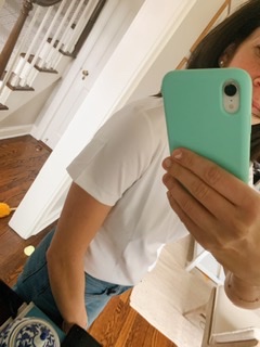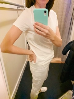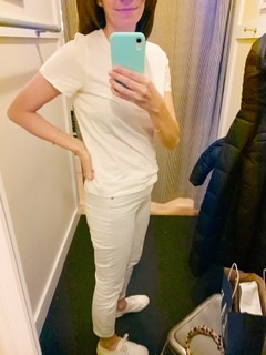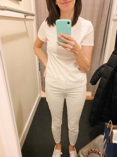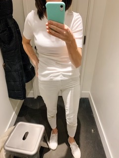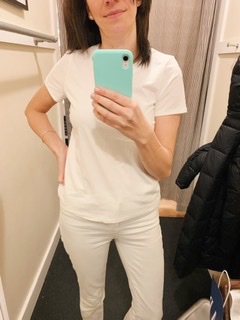 The perfect white tee shirt. Seems like an easy item to find. They are basic, closet staples, and displayed at any store out there at any price point. However, the options and variety can be overwhelming. I spent most of January researching tee shirts that were recommended by YOU! All were big name brands in the popular crew neck style. These reviews are based on trying the tee shirts on and not wear, tear and washing. The photos were taken mostly in dressing rooms where the lighting is not the most flattering but it does the trick for the try on!