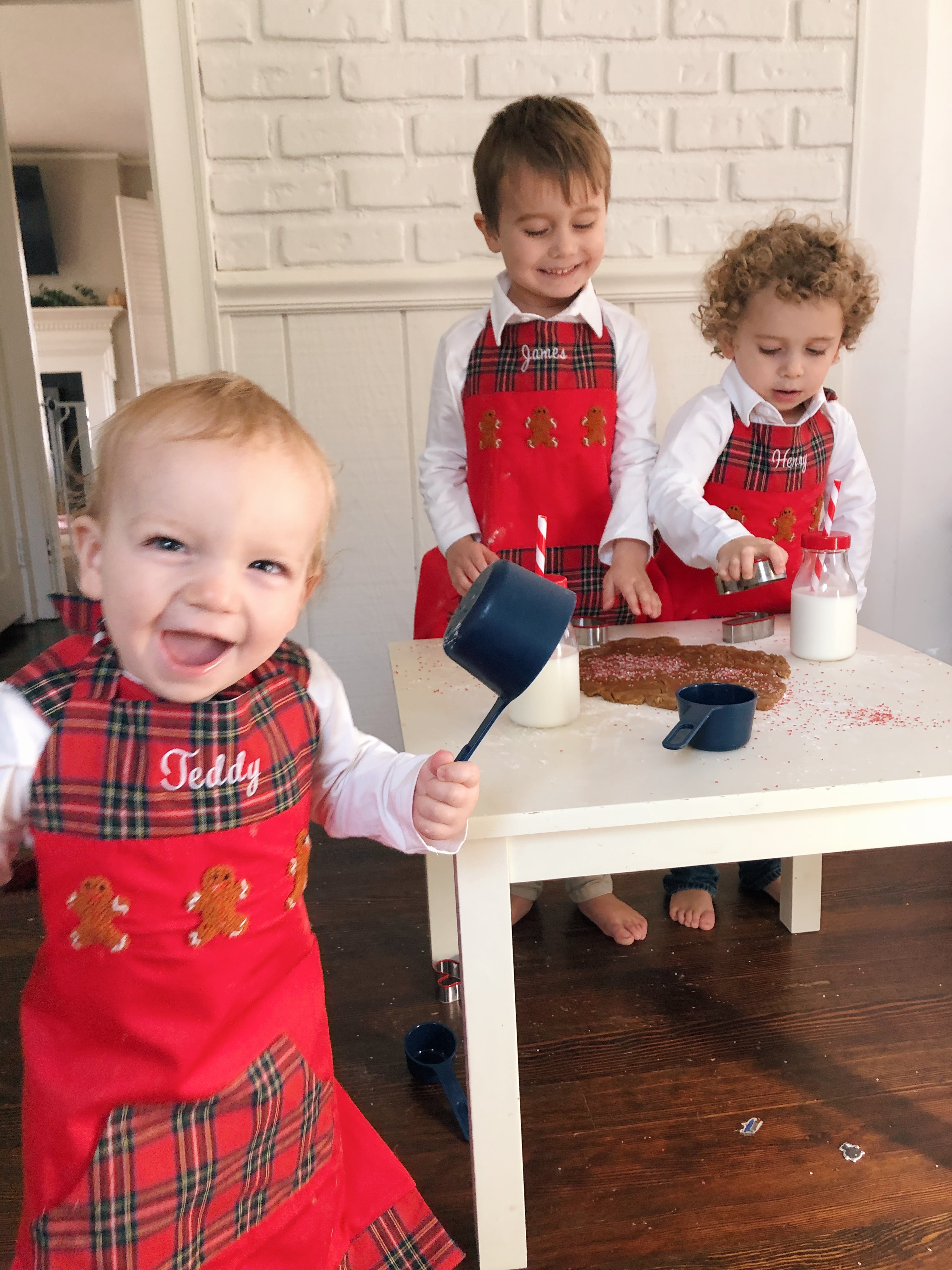 As a new treat this year, we added these adorable gingerbread men aprons from The Bella Bean to use as we bake. The gingerbread men are embroidered as well as each boy’s name. There are several fonts and colors to choose from, too. They’re really cute and would make a great gift! I know the boys will love to wear them for years to come!